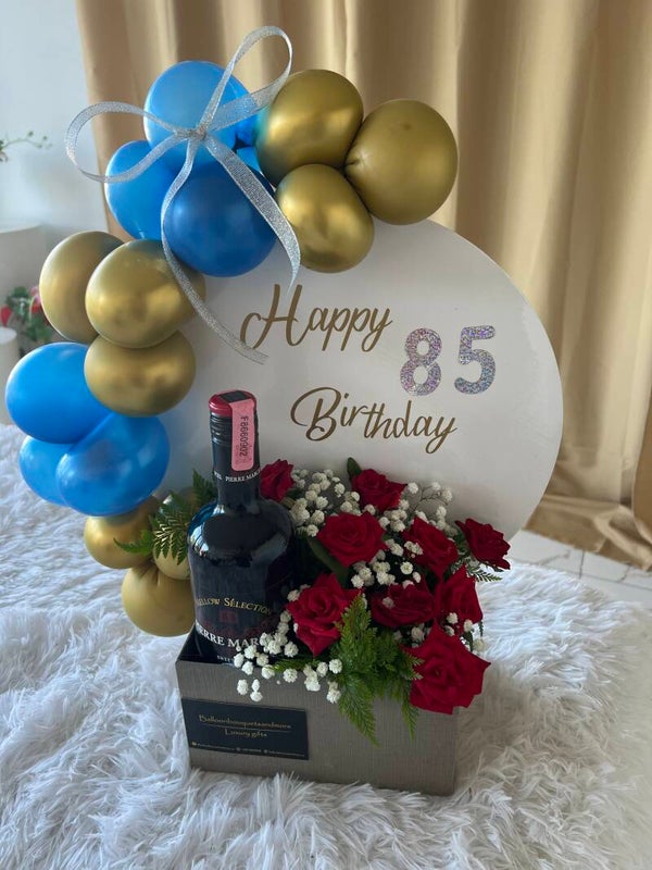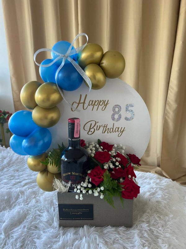 This box includes a roses bouquet made with Suriname roses a wine, some balloons and a text.